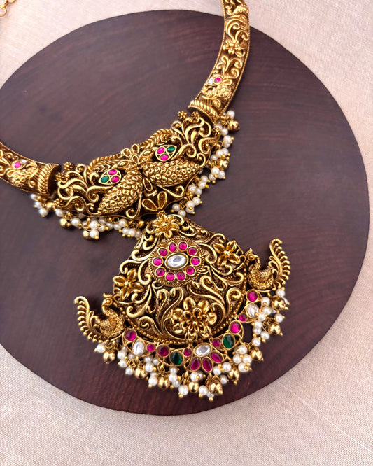 Antique Gold Peacock Necklace Set – Jadau Detailing with Pearl Drops | NC192