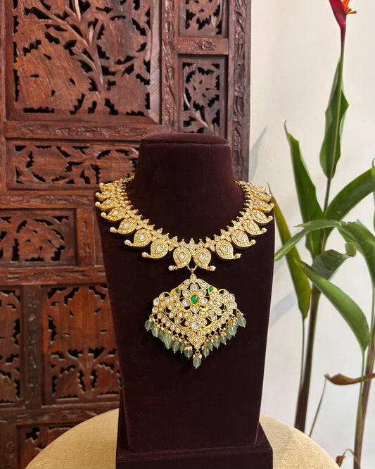 Antique Finish Jadau Kundan Mango Necklace with Detachable Pendant – Gold Plated | NC031
