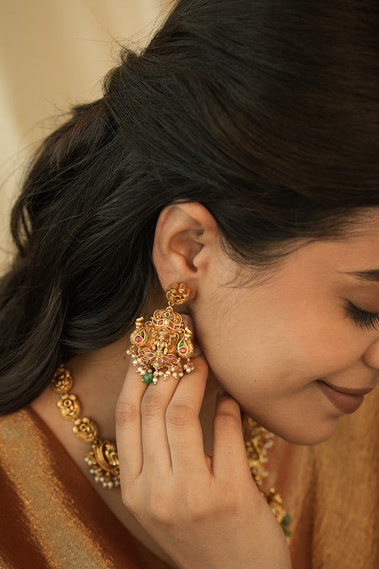 Antique Gold-Plated Jadau Necklace Set with Lakshmi & Elephant Motifs
