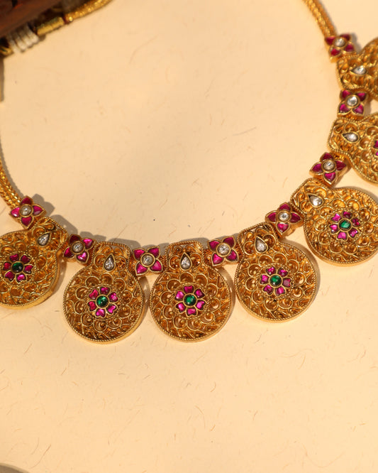 Jadau Kundan Floral Coin Necklace – Antique Gold Finish with Intricate Detailing | NC034
