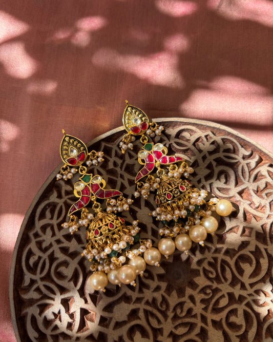 Antique Gold Peacock Necklace Set – Jadau Detailing with Pearl Drops | NC192