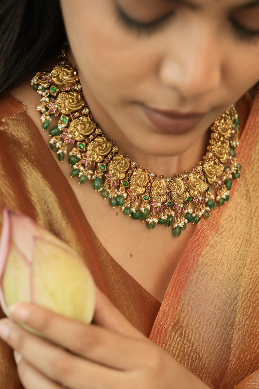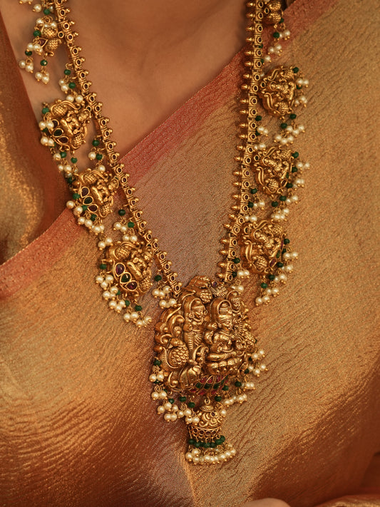 Lakshmi Gold-Finish Temple Necklace Set with Jadau Kundan Detailing | NC156