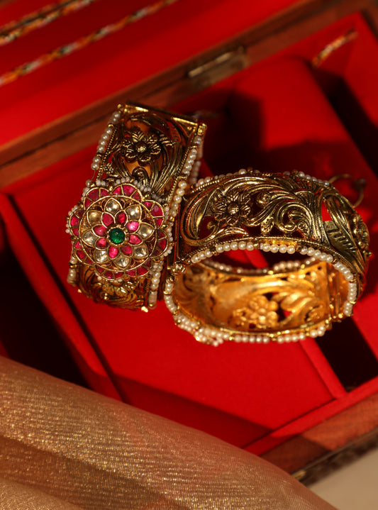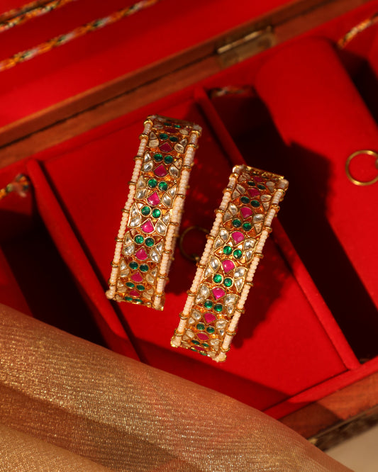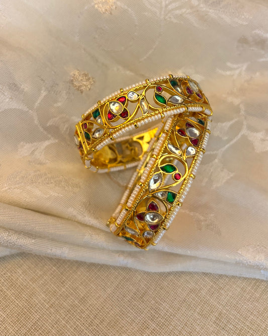 Jadau Kundan Gold Plated Bangles — Multicolor with Pearl Detailing | BA012
