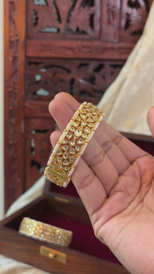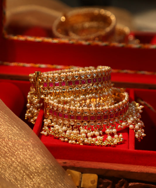 Bridal Statement Bangles — Pink & White Jadau Kundan with Pearl Hangings | BA004