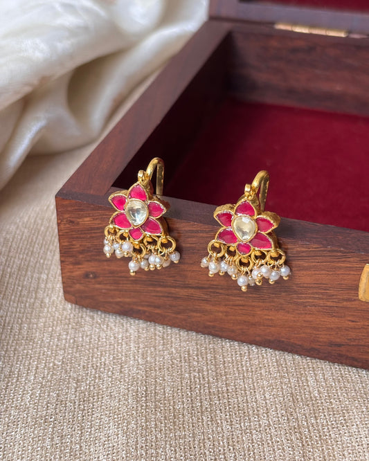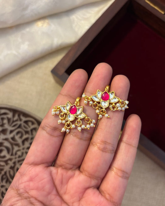 Handcrafted Pink & White Lotus Bugadi – Jadau Kundan Ear Accessory | ER076