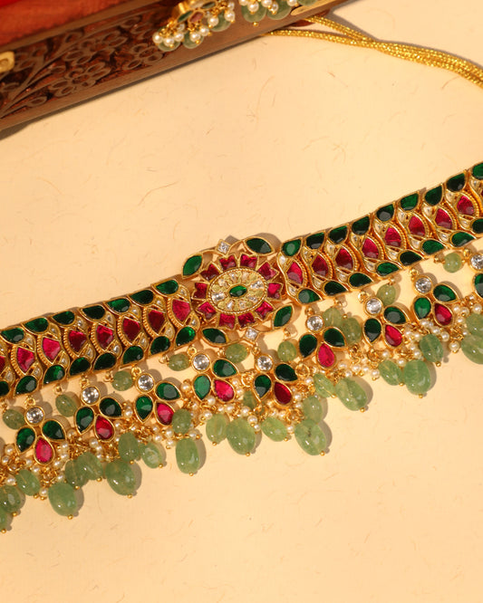 Bridal Jadau Kundan Floral Choker Set in Green & Ruby with Matching Earrings | NC037
