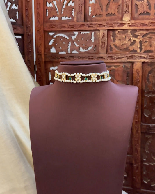 White Pearl & Kundan Floral Choker with Green Accents | NC077
