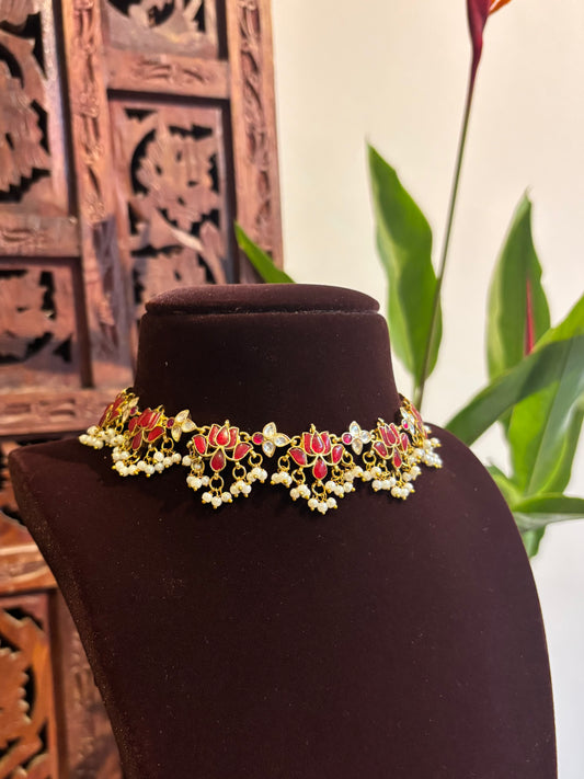 Ruby White Lotus Kundan Choker Set with Earrings – Minimal Statement | NC157