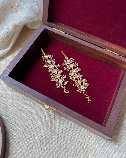 Lotus Floral Jadau Kundan Straight Ear Chain – Ruby & White | EC101