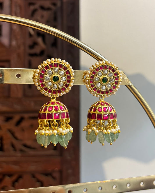 Parrot Minimal Multicolor Jadau Kundan Jhumkas with Pearl Hangings | ER149