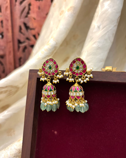Lotus Charm Multicolor Jadau Kundan Jhumkas with Pearl Hangings | ER043