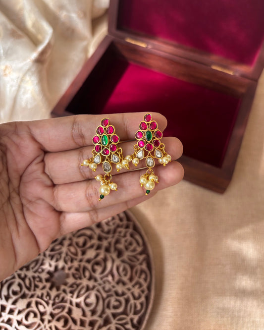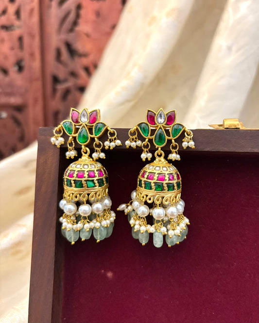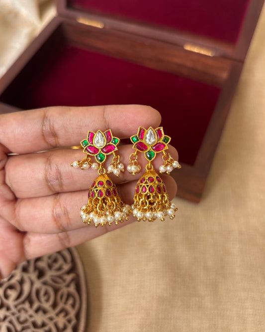 Lotus Charm Multicolor Jadau Kundan Jhumkas with Pearl Hangings | ER043