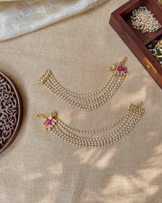Jadau Kundan Four-Layer Pearl Ear Chain – Ruby & White | EC084