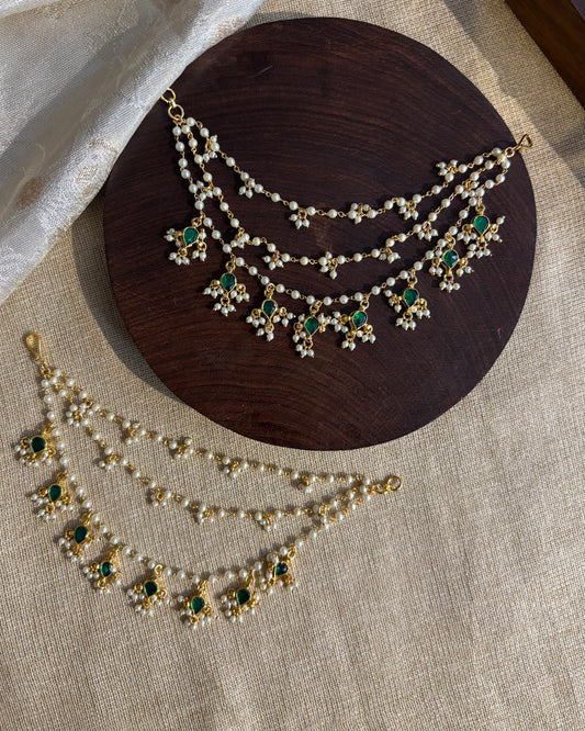 Minimal Jadau Kundan Three-Layer Pearl Ear Chain – Green & White | EC100