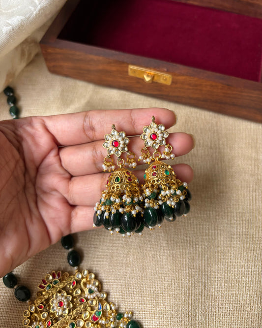 Dark Green Beads Haram with Antique Gold Kundan Pendant & Matching Jhumkas | NC057