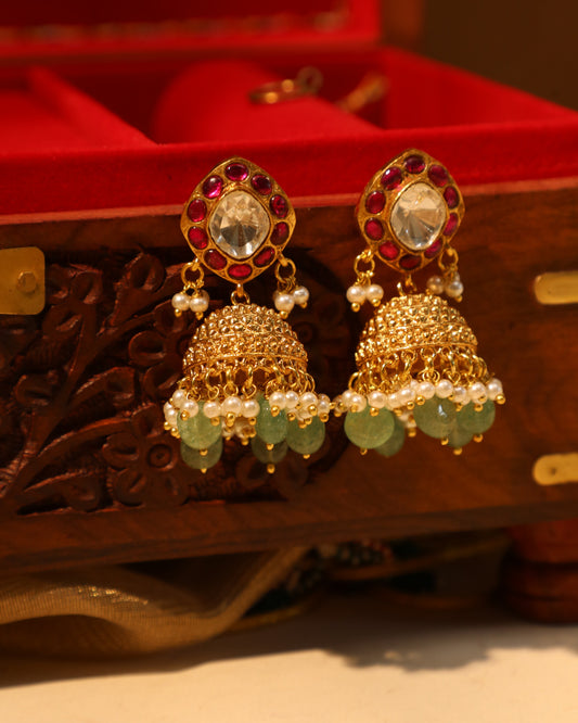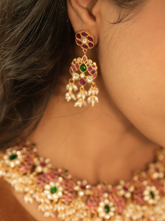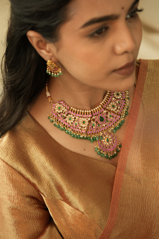 Bridal Jadau Kundan Floral Choker Set in Green & Ruby with Matching Earrings | NC037