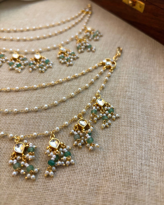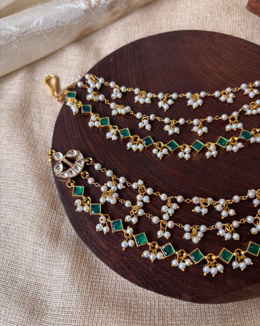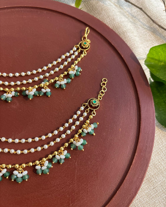 Minimal Jadau Kundan Three-Layer Pearl Ear Chain – Green & White | EC030
