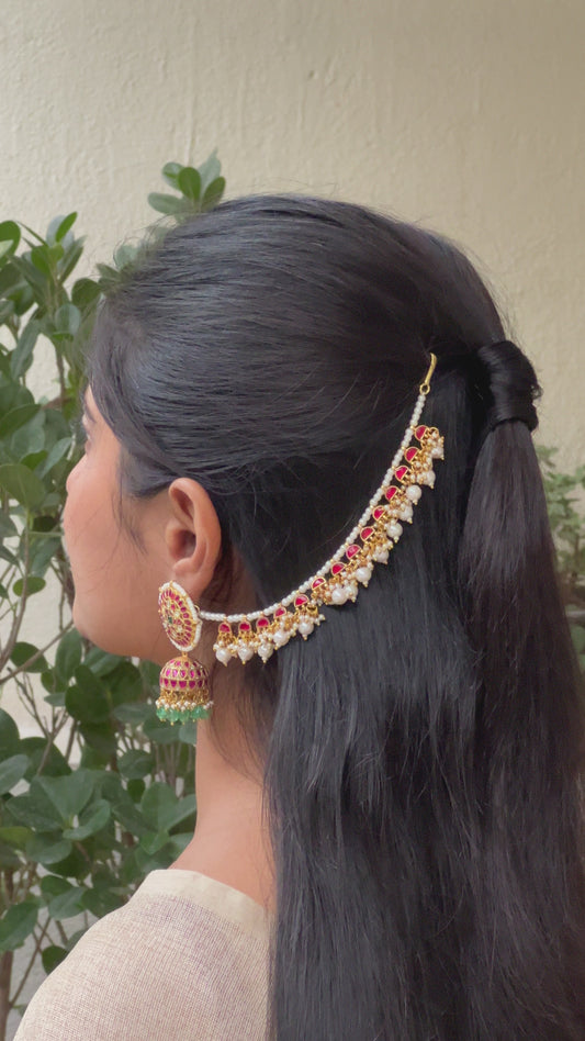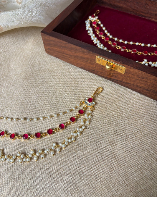 Minimal Jadau Kundan Three-Layer Pearl Ear Chain – Ruby & White | EC029