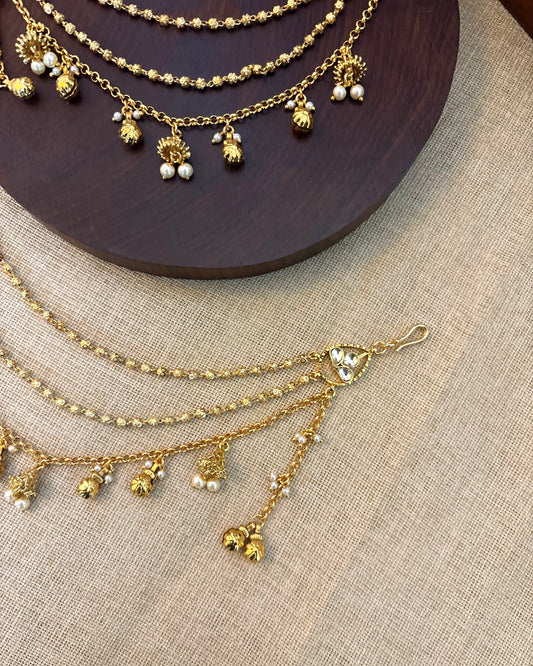 Gold Plated Triple Layered Jadau Kundan Pearl Ear Chain