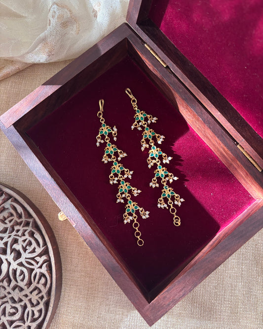 Floral Jadau Kundan Straight Ear Chain – Green | EC036