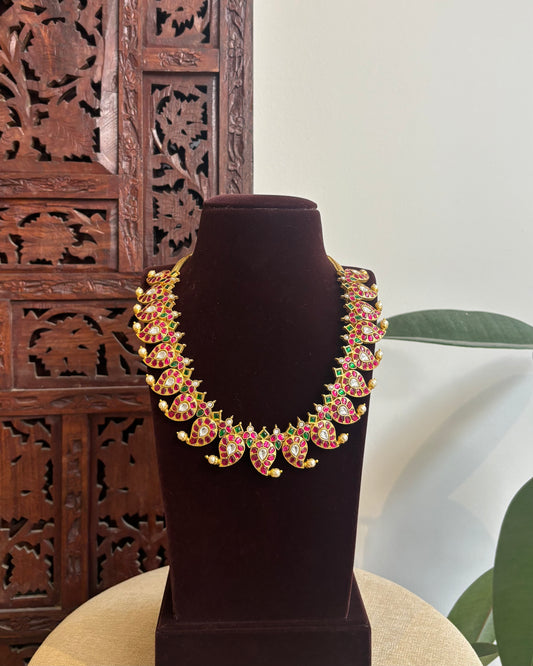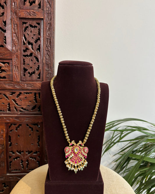 Peacock Motif Impon Pendant Attigai Necklace – Ruby & White | NC392