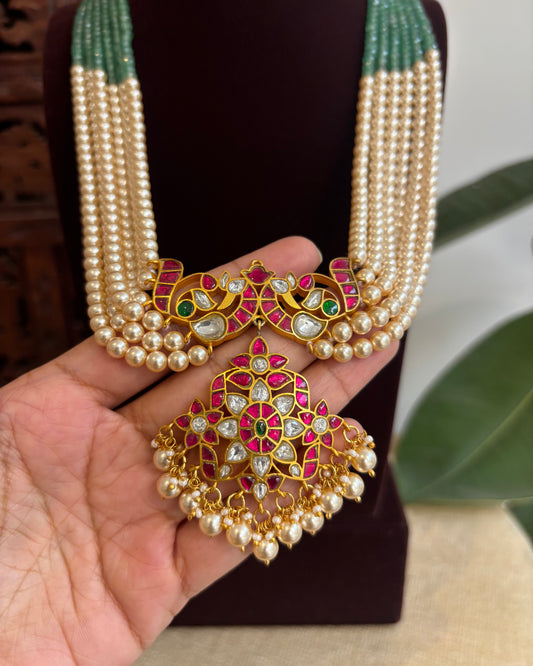 Statement Floral Jadau Kundan Pendant with Mint Green Beads & Pearl Mala | NC368
