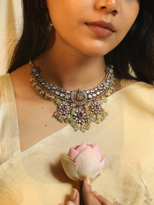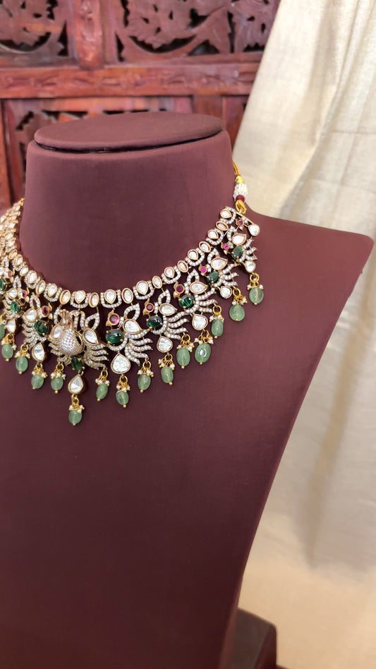 Peacock Kanti Necklace Set with Moissanite Drop Accents and Matching Earrings | NC107