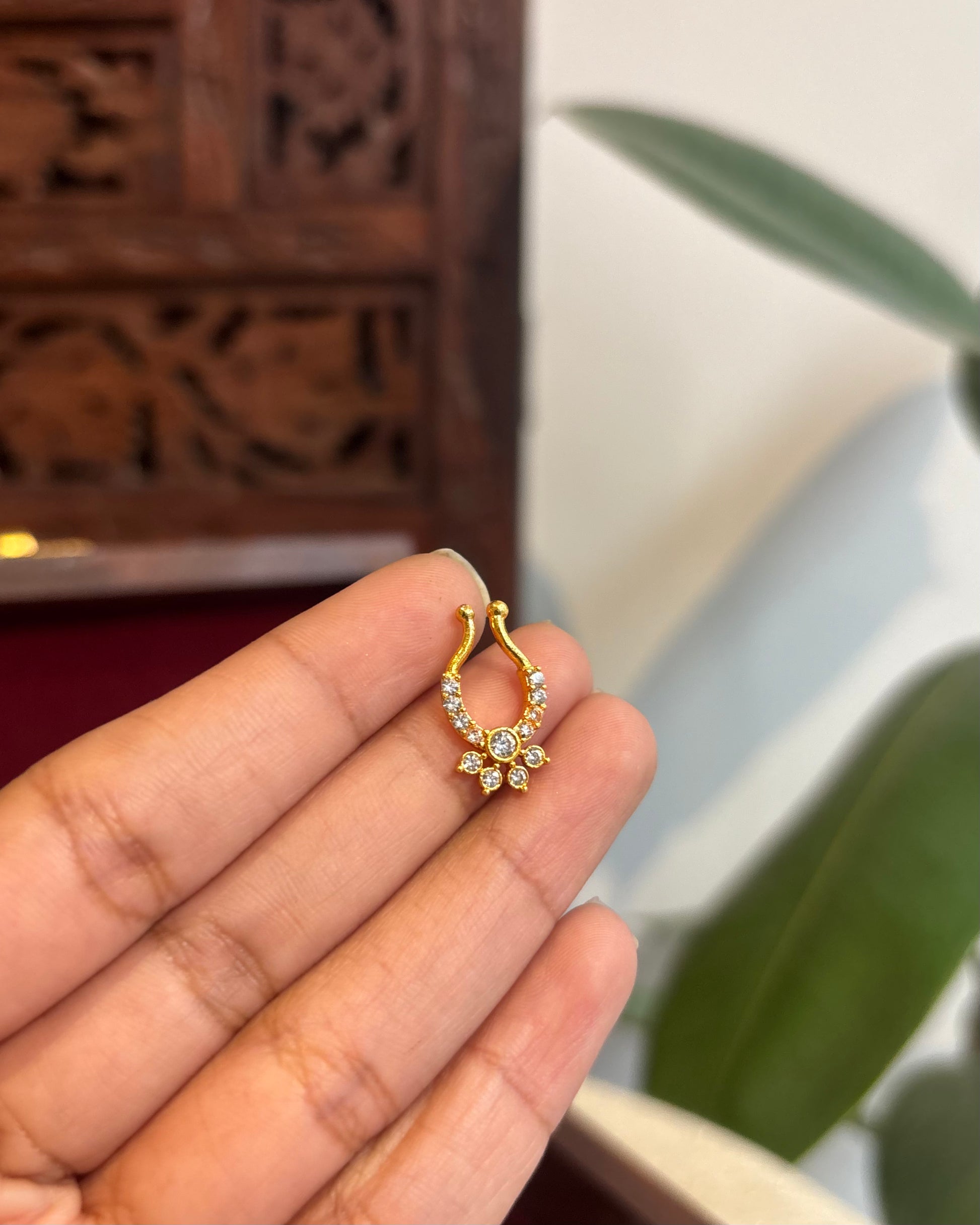 A delicate blend of tradition and charm, this nosepin is a graceful addition to your festive or bridal look. Handcrafted with precision, it features intricate work set in a subtle base that enhances its timeless appeal. Whether you're a bride looking to complete your ensemble or simply adding a touch of tradition to your style, this nosepin is the perfect understated statement. Lightweight, comfortable, and beautiful — it’s elegance in the tiniest detail.