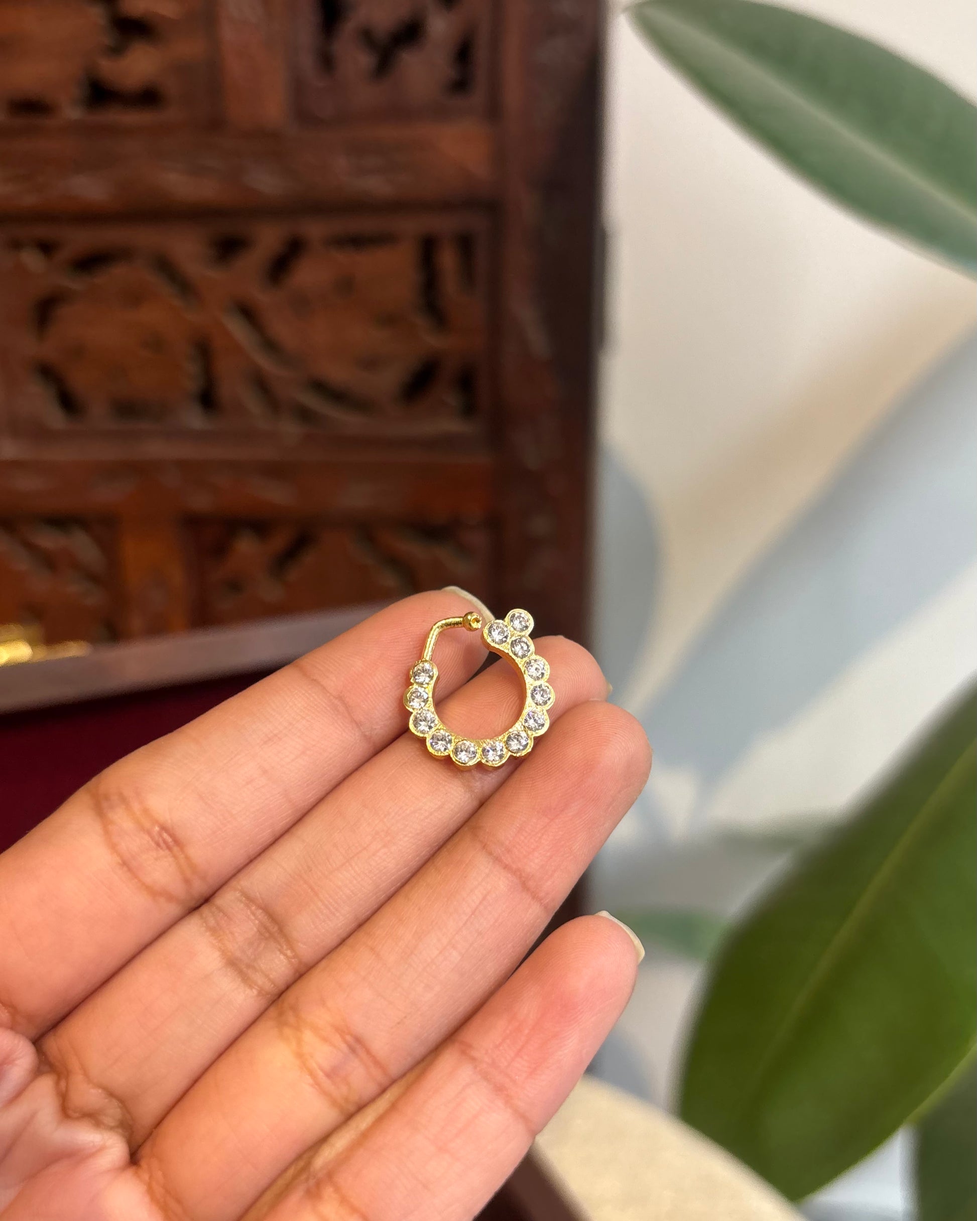 A delicate blend of tradition and charm, this nosepin is a graceful addition to your festive or bridal look. Handcrafted with precision, it features intricate work set in a subtle base that enhances its timeless appeal. Whether you're a bride looking to complete your ensemble or simply adding a touch of tradition to your style, this nosepin is the perfect understated statement. Lightweight, comfortable, and beautiful — it’s elegance in the tiniest detail.