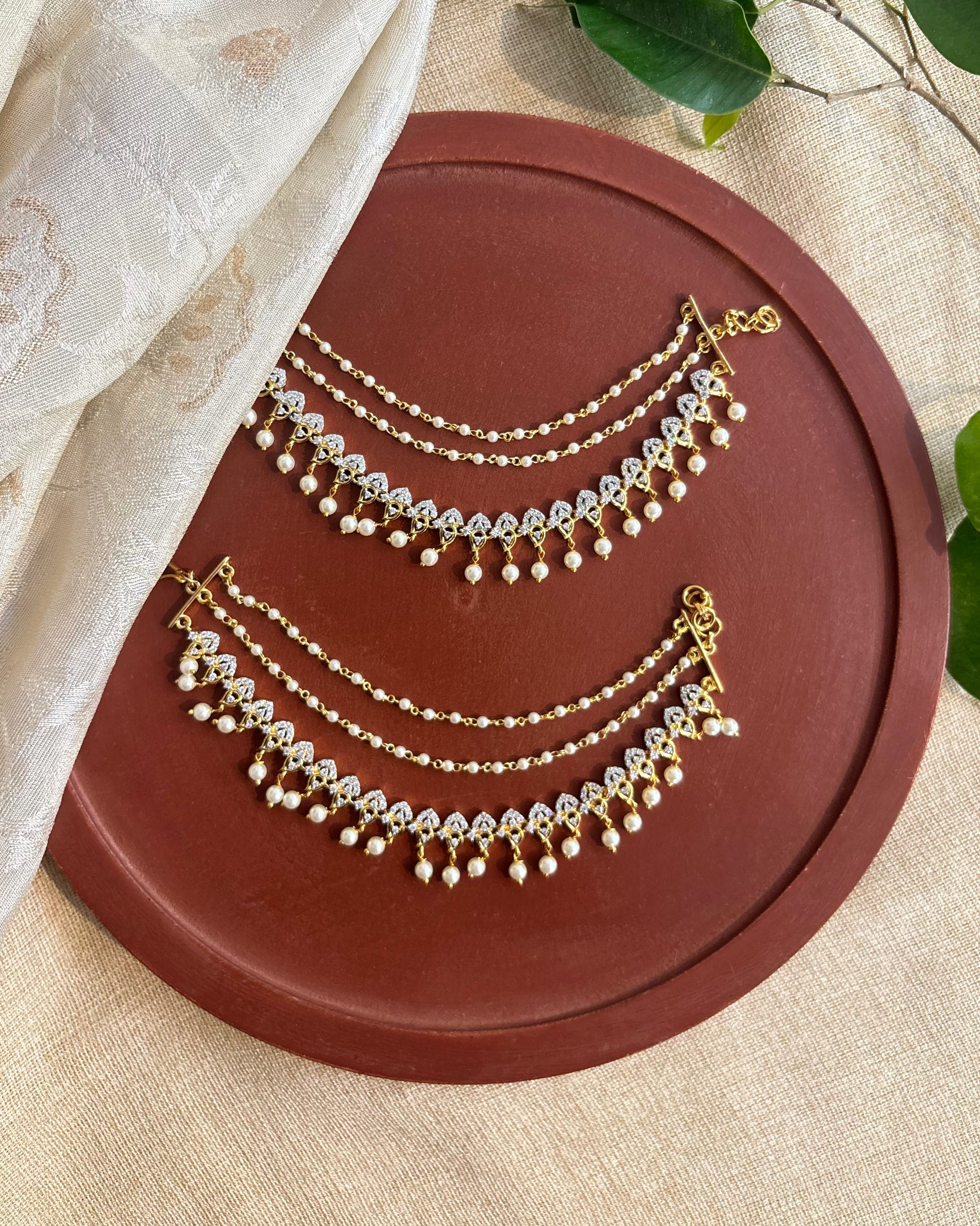 A regal three-layer ear chain finished in rich antique polish, featuring sparkling kemp stones that exude traditional South Indian charm. Designed to drape gracefully along the ear, this piece adds depth and grandeur to bridal jewelry sets. The intricate craftsmanship and layered design make it a perfect complement to heavy jhumkas or chandbalis, completing your bridal look with timeless elegance.