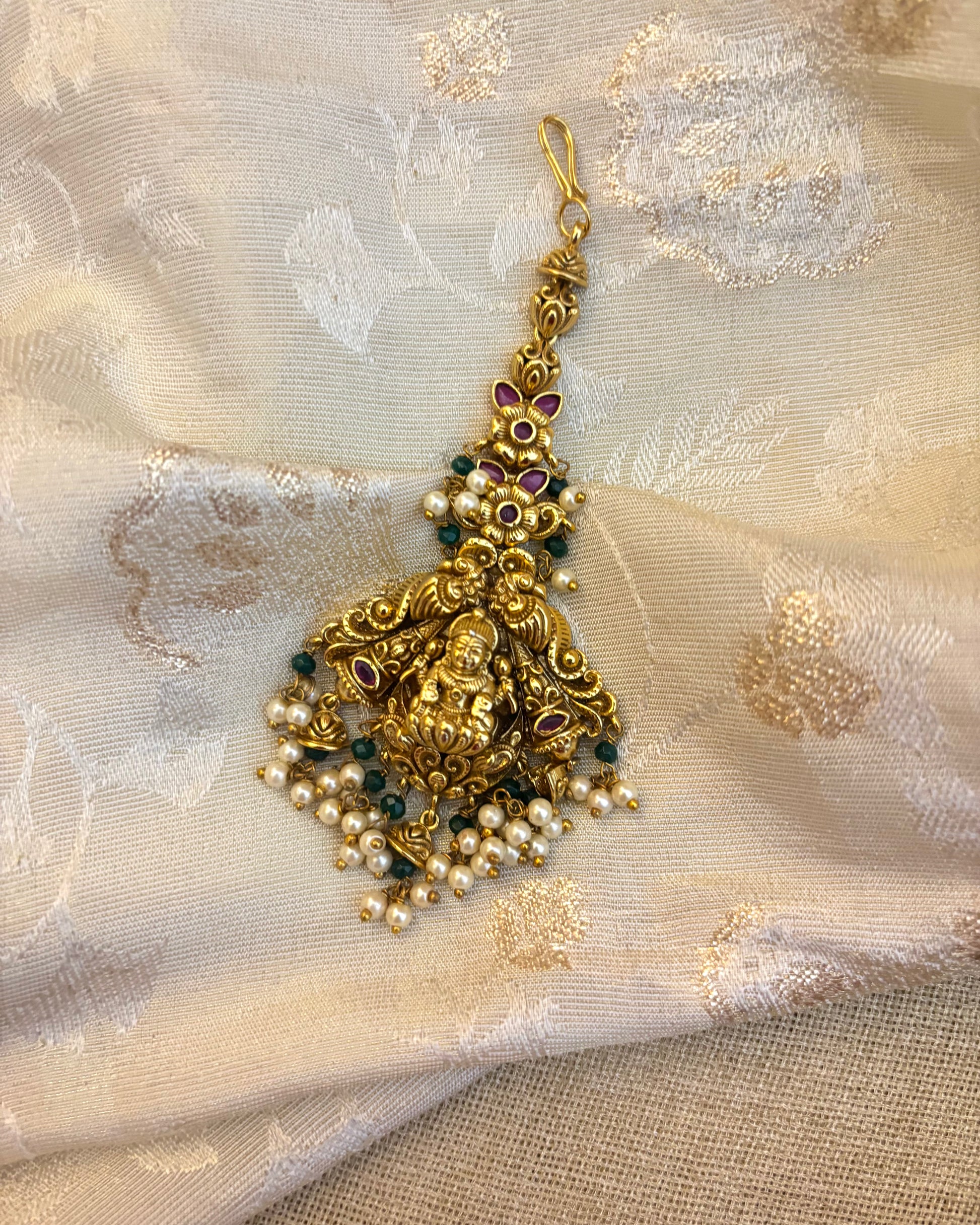 Antique Maang Tikka, featuring a lakshmi motif at its center. Intricately crafted, this piece showcases detailed temple-style carvings, adorned with Kundan-set ruby and emerald accents that bring a vibrant contrast. A cascade of delicate gold bead droplets enhances its royal appeal, making it an ideal choice for brides, festive occasions, and cultural celebrations. This maang tikka is a timeless treasure.
