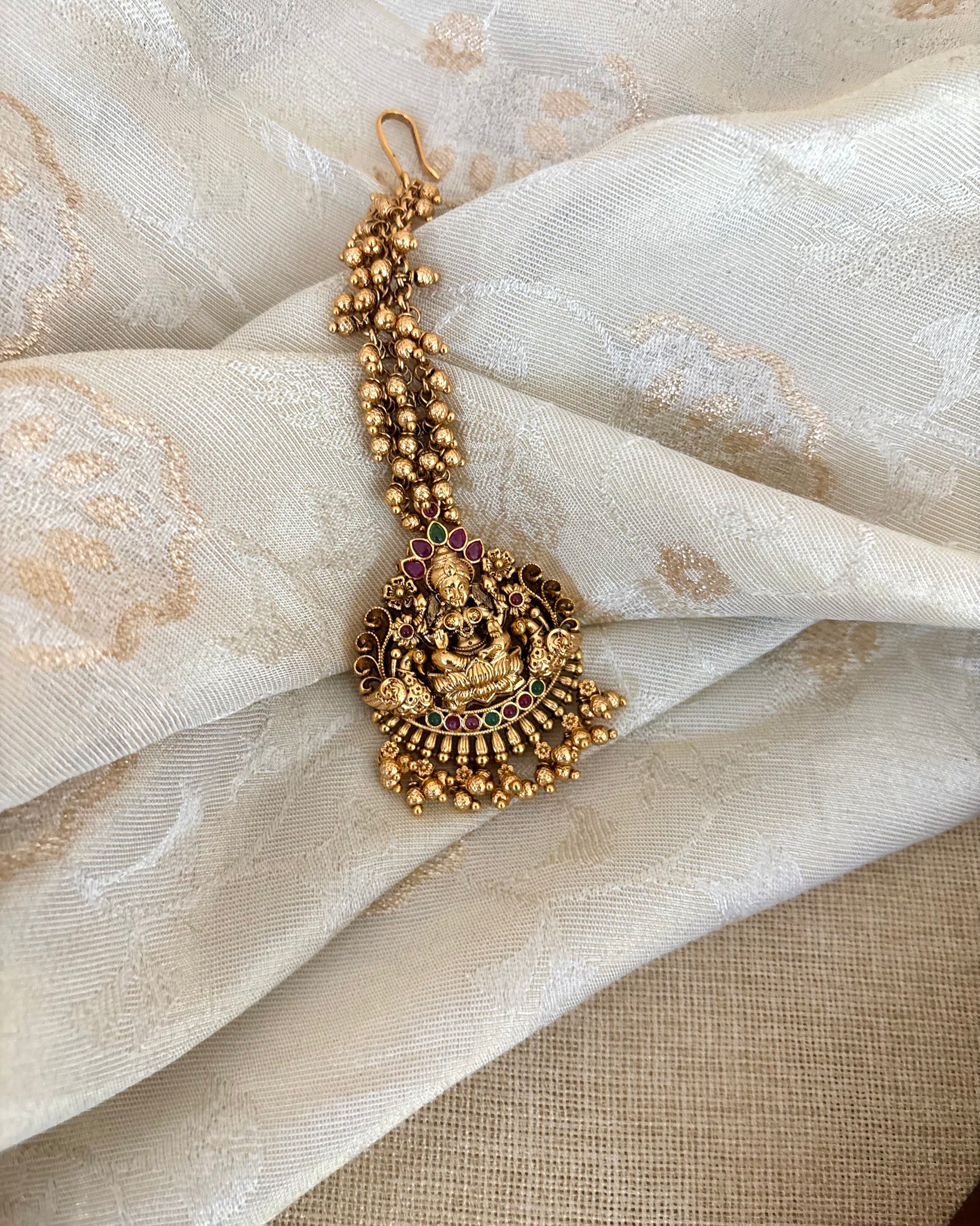 Antique Maang Tikka, featuring a lakshmi motif at its center. Intricately crafted, this piece showcases detailed temple-style carvings, adorned with Kundan-set ruby and emerald accents that bring a vibrant contrast. A cascade of delicate golden droplets enhances its royal appeal, making it an ideal choice for brides, festive occasions, and cultural celebrations. This maang tikka is a timeless treasure.