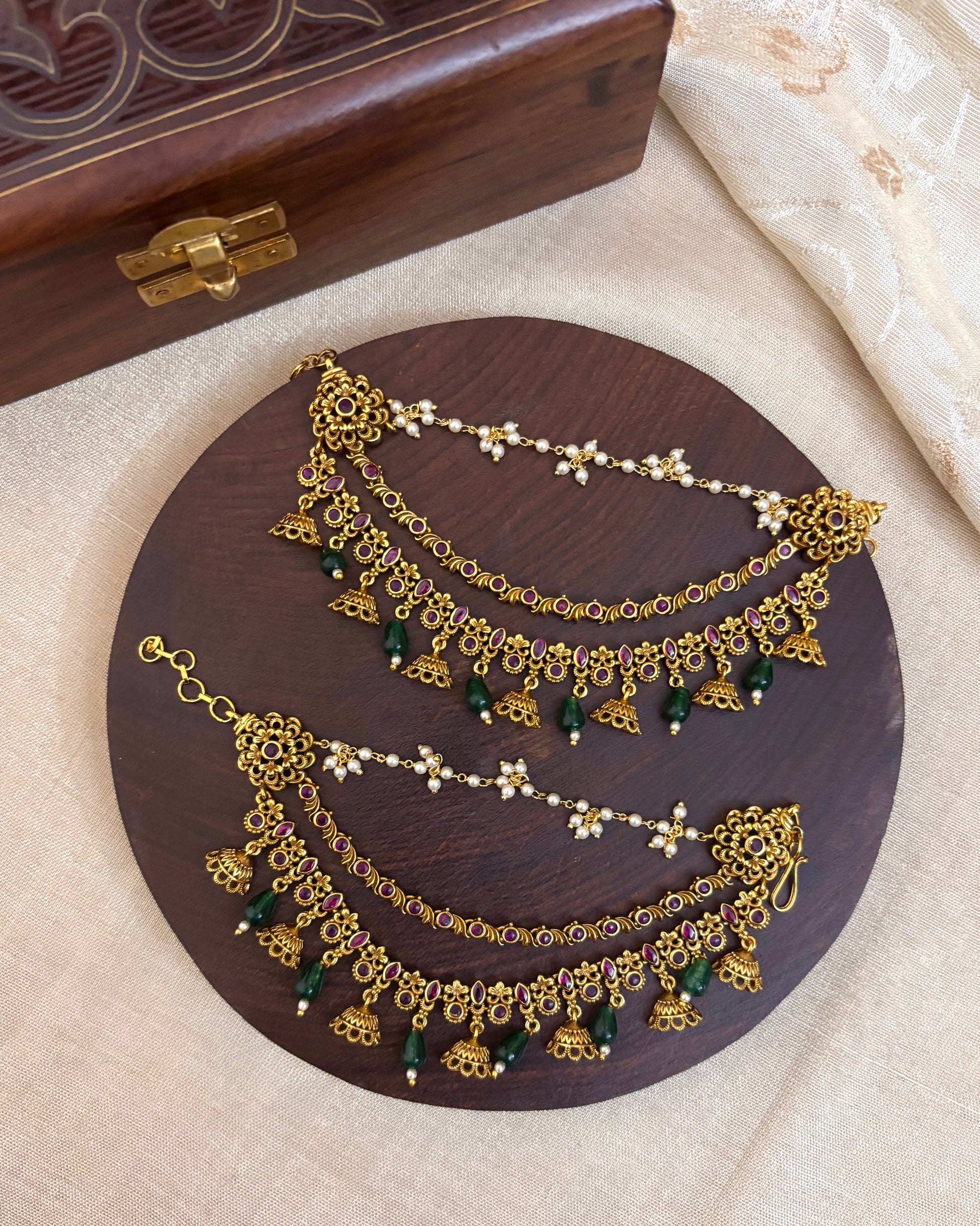 A regal three-layer ear chain finished in rich antique polish, featuring sparkling kemp stones that exude traditional South Indian charm. Designed to drape gracefully along the ear, this piece adds depth and grandeur to bridal jewelry sets. The intricate craftsmanship and layered design make it a perfect complement to heavy jhumkas or chandbalis, completing your bridal look with timeless elegance.