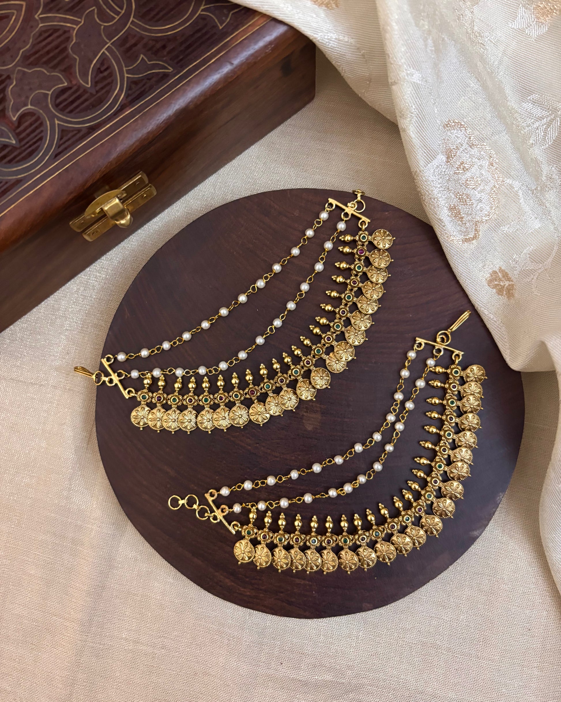 A regal three-layer ear chain finished in rich antique polish, featuring sparkling kemp stones that exude traditional South Indian charm. Designed to drape gracefully along the ear, this piece adds depth and grandeur to bridal jewelry sets. The intricate craftsmanship and layered design make it a perfect complement to heavy jhumkas or chandbalis, completing your bridal look with timeless elegance.