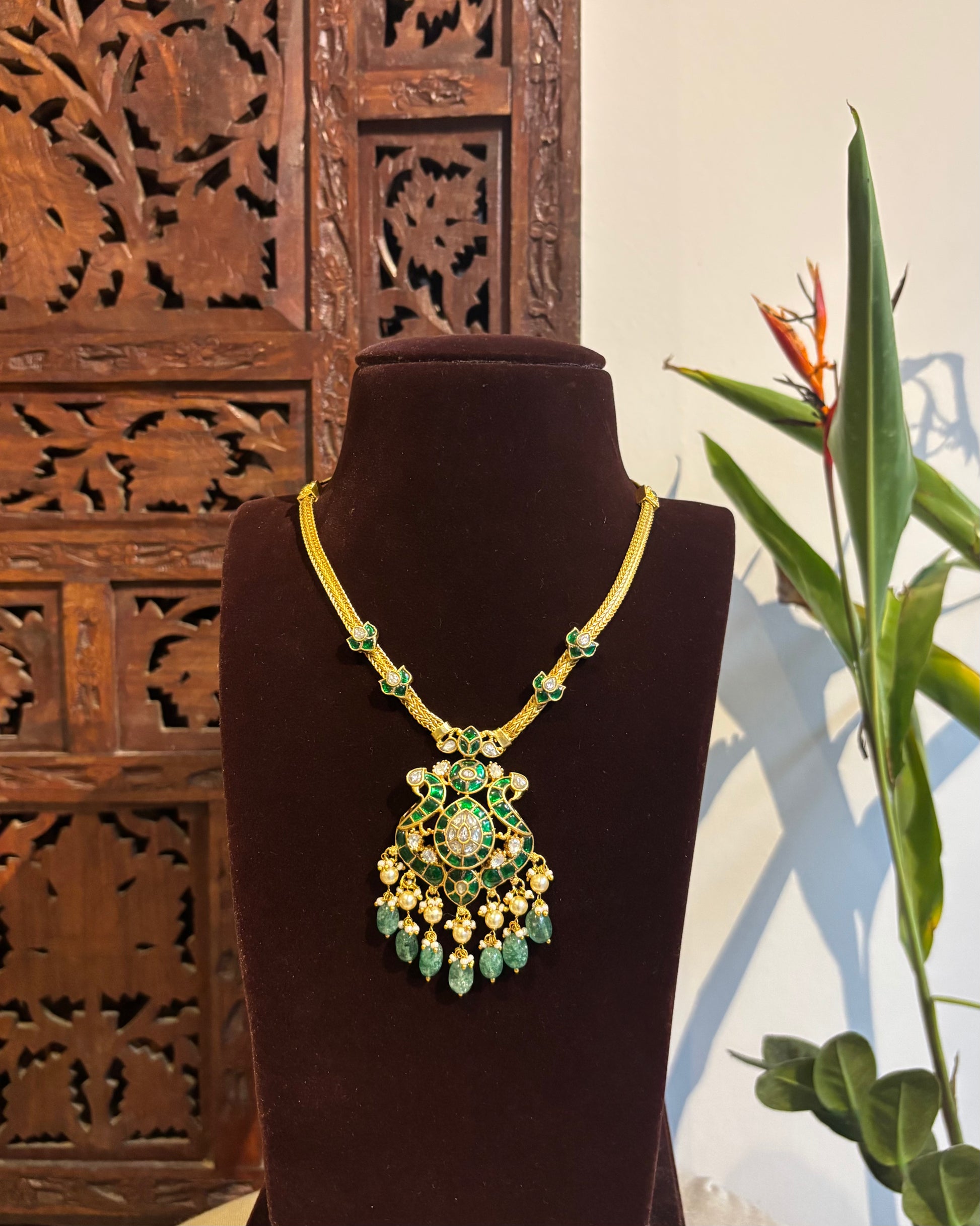 This necklace offers a minimal yet statement-making charm, making it an ideal choice for festive occasions, intimate weddings, or bridesmaid looks. Its subtle shimmer and balanced design make it versatile enough to pair with both sarees and lehengas.