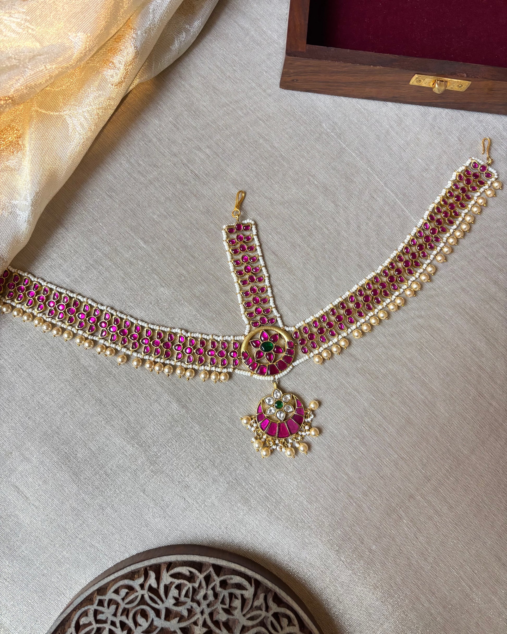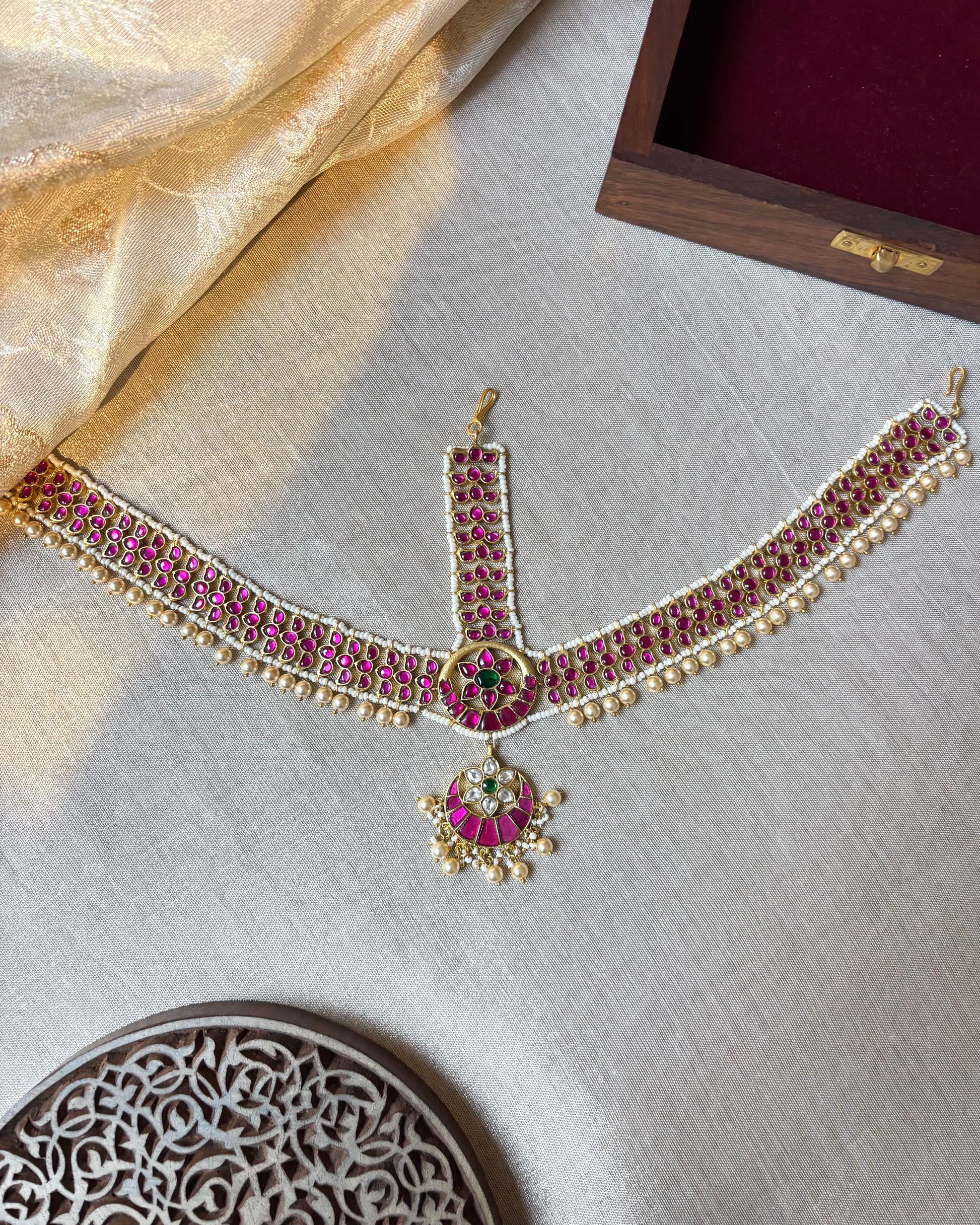 A masterpiece of timeless artistry, this Jadau Kundan Mathapatti is adorned with intricate floral detailing, creating a design that is both unique and breathtakingly beautiful. Crafted using the traditional Jadau technique, it captures the essence of heritage while making a bold contemporary statement. Perfect for brides who seek elegance with grandeur, this mathapatti frames your face with regal charm and adds an unforgettable touch to your wedding look. Truly a statement piece for the modern royal bride.