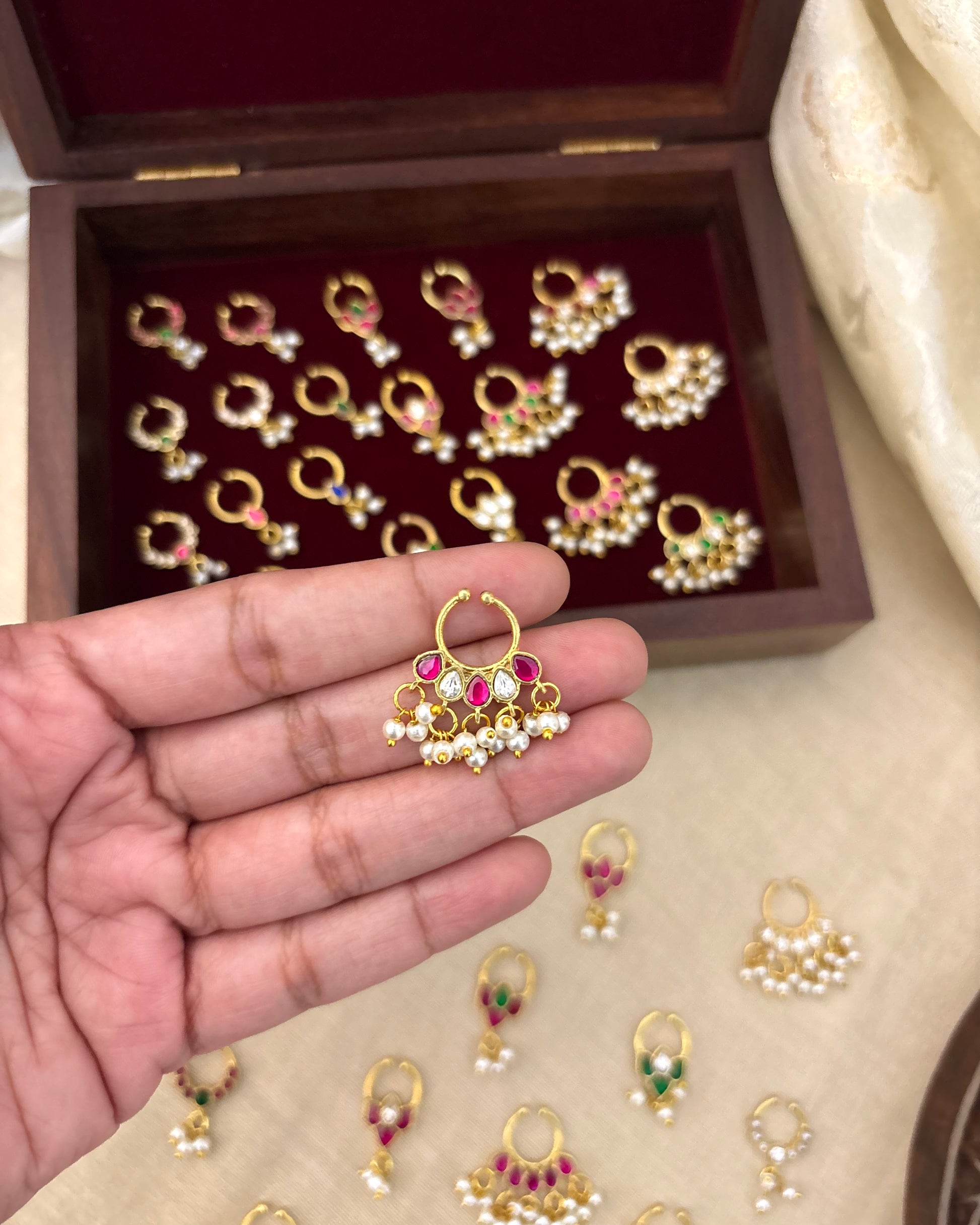 A delicate blend of tradition and charm, this nosepin is a graceful addition to your festive or bridal look. Handcrafted with precision, it features intricate work set in a subtle base that enhances its timeless appeal. Whether you're a bride looking to complete your ensemble or simply adding a touch of tradition to your style, this nosepin is the perfect understated statement. Lightweight, comfortable, and beautiful — it’s elegance in the tiniest detail.