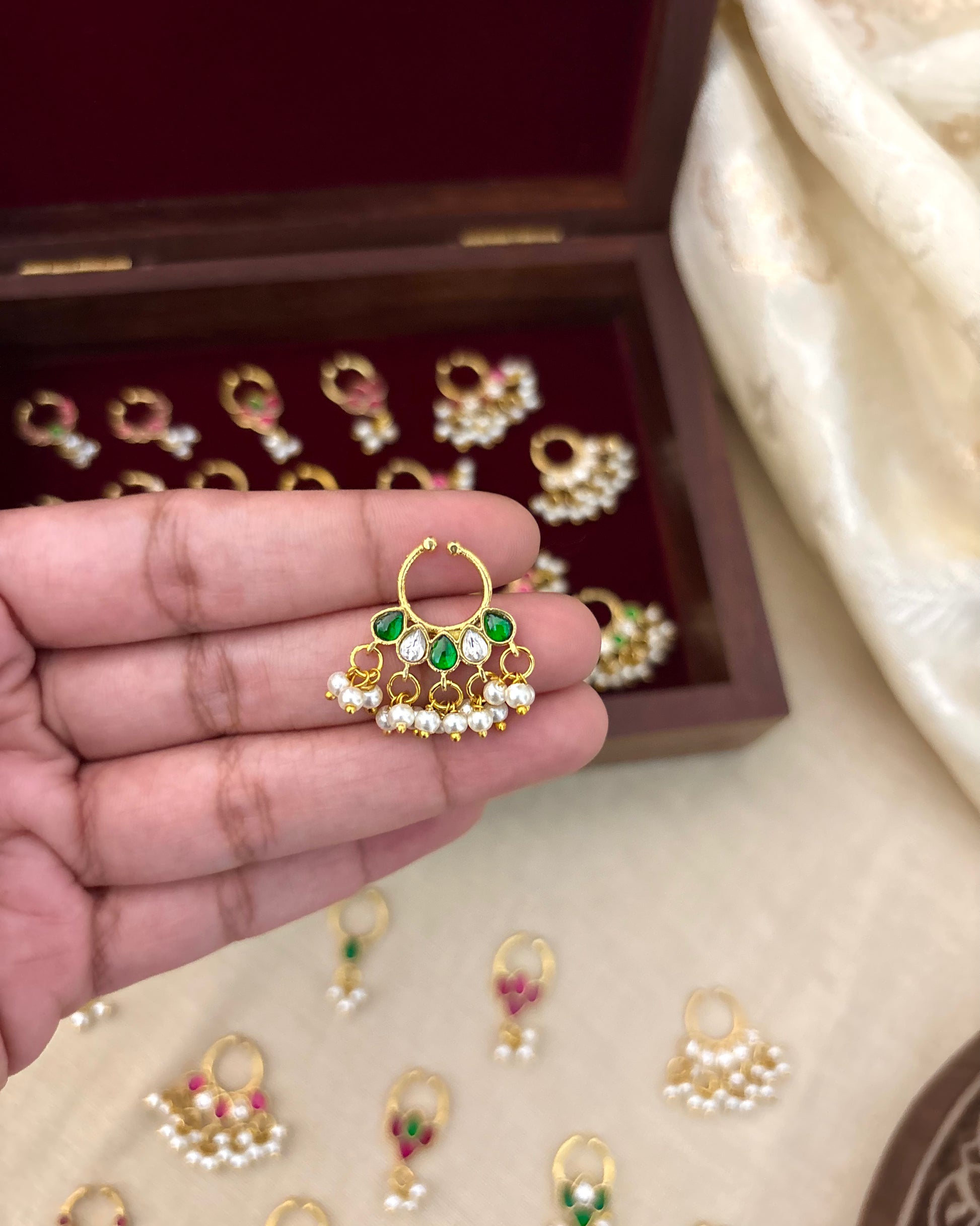 A delicate blend of tradition and charm, this nosepin is a graceful addition to your festive or bridal look. Handcrafted with precision, it features intricate work set in a subtle base that enhances its timeless appeal. Whether you're a bride looking to complete your ensemble or simply adding a touch of tradition to your style, this nosepin is the perfect understated statement. Lightweight, comfortable, and beautiful — it’s elegance in the tiniest detail.