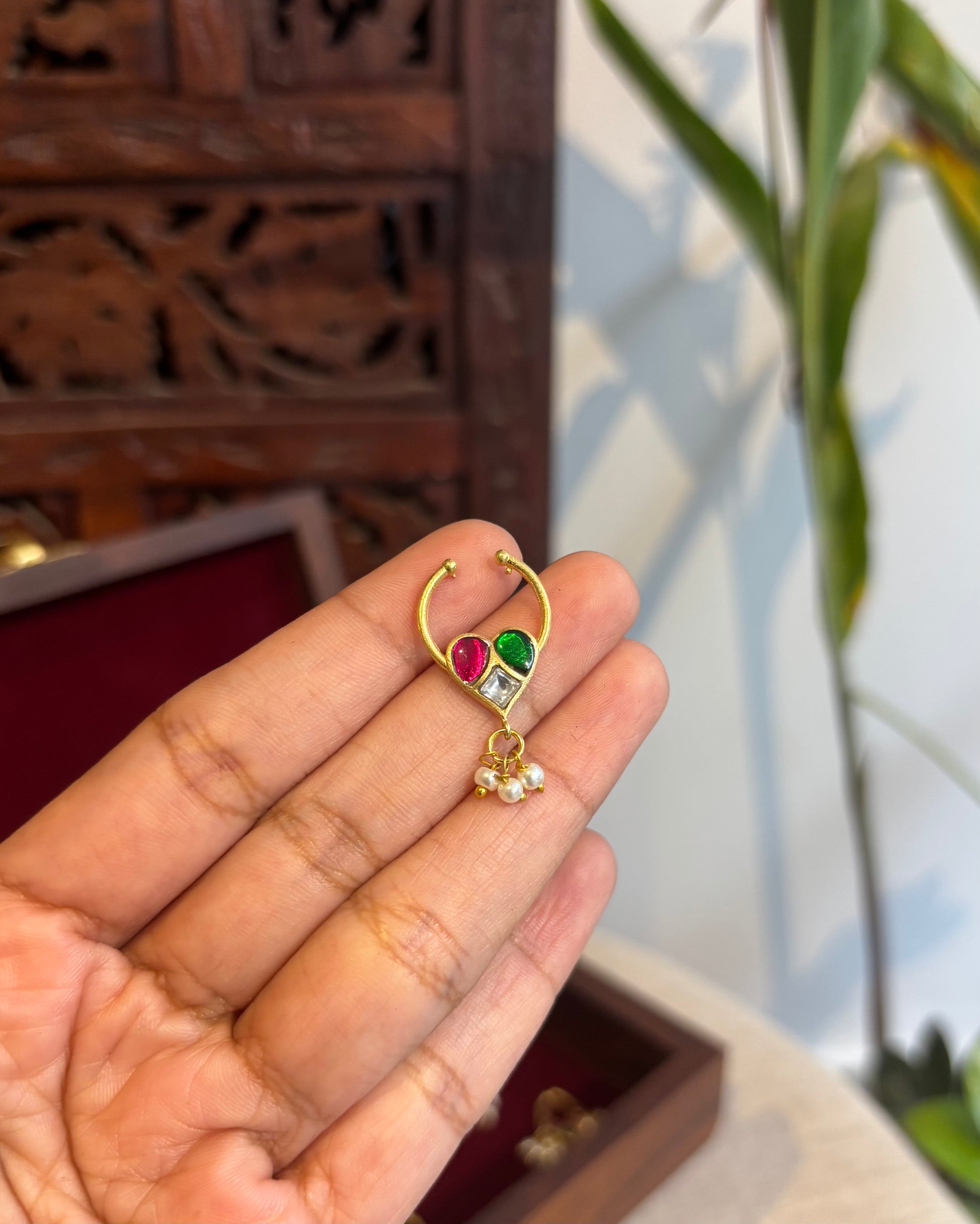 A delicate blend of tradition and charm, this nosepin is a graceful addition to your festive or bridal look. Handcrafted with precision, it features intricate work set in a subtle base that enhances its timeless appeal. Whether you're a bride looking to complete your ensemble or simply adding a touch of tradition to your style, this nosepin is the perfect understated statement. Lightweight, comfortable, and beautiful — it’s elegance in the tiniest detail.