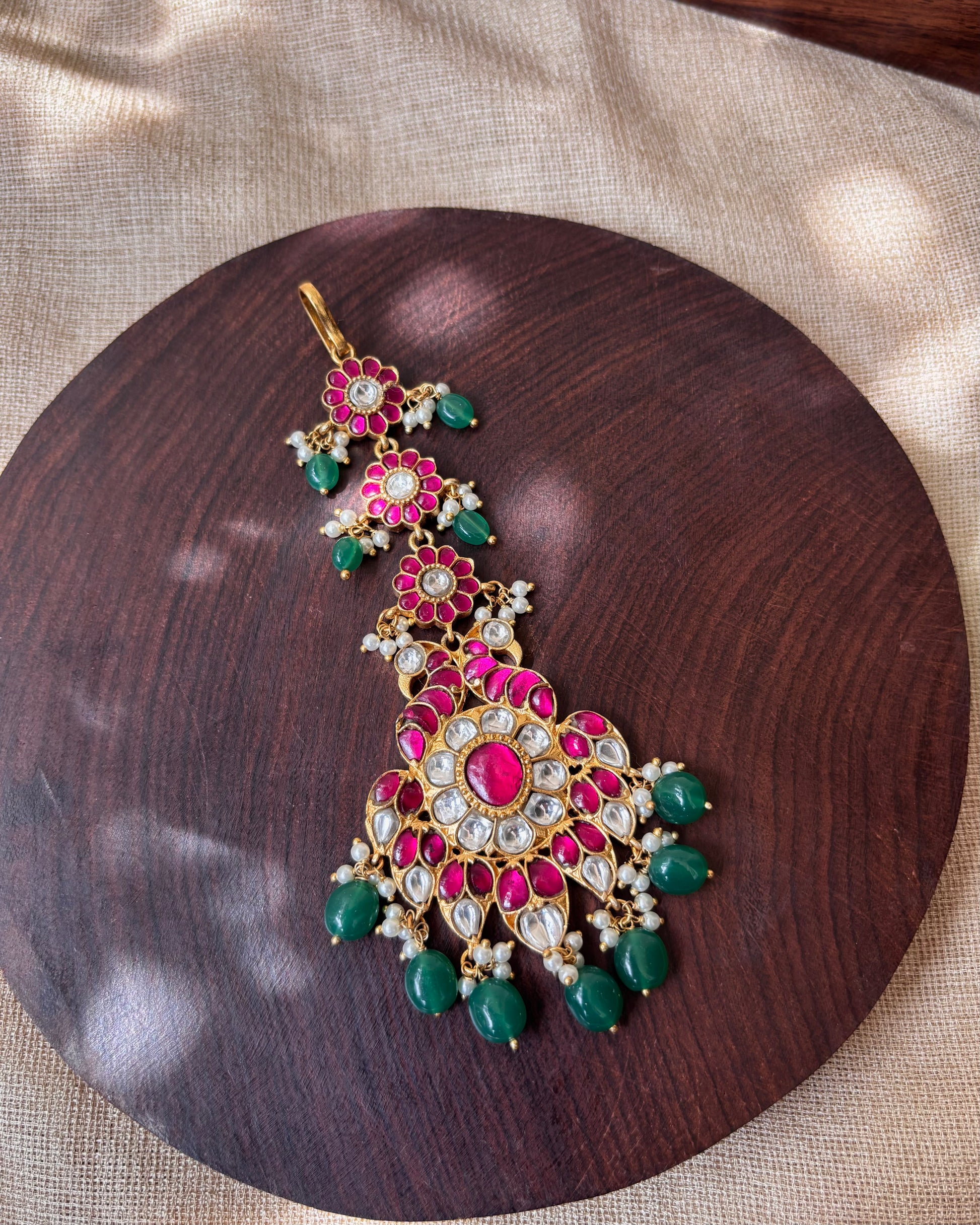 A breathtaking blend of traditional craftsmanship and contemporary elegance, this exquisite Jadau Kundan maang tikka is adorned with intricate and majestic floral-inspired motifs. A statement piece that radiates grace, it is the perfect accessory for weddings, festive celebrations, and special occasions.