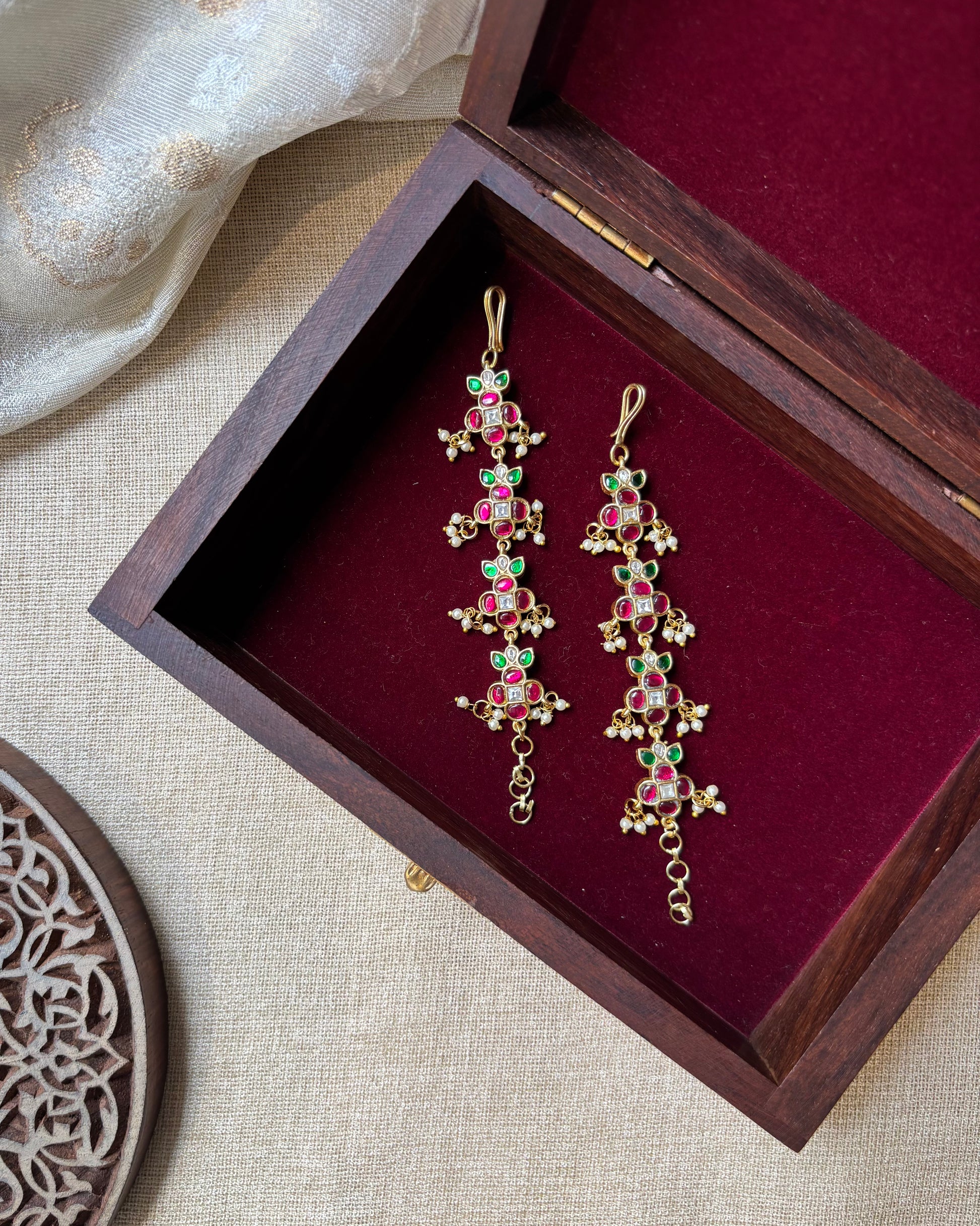Add a touch of elegance to your look with this beautifully handcrafted straight ear chain, featuring delicate multicolor Jadau Kundan stones arranged in an intricate floral pattern. Each motif is finished with tiny pearls that add a soft, graceful charm.