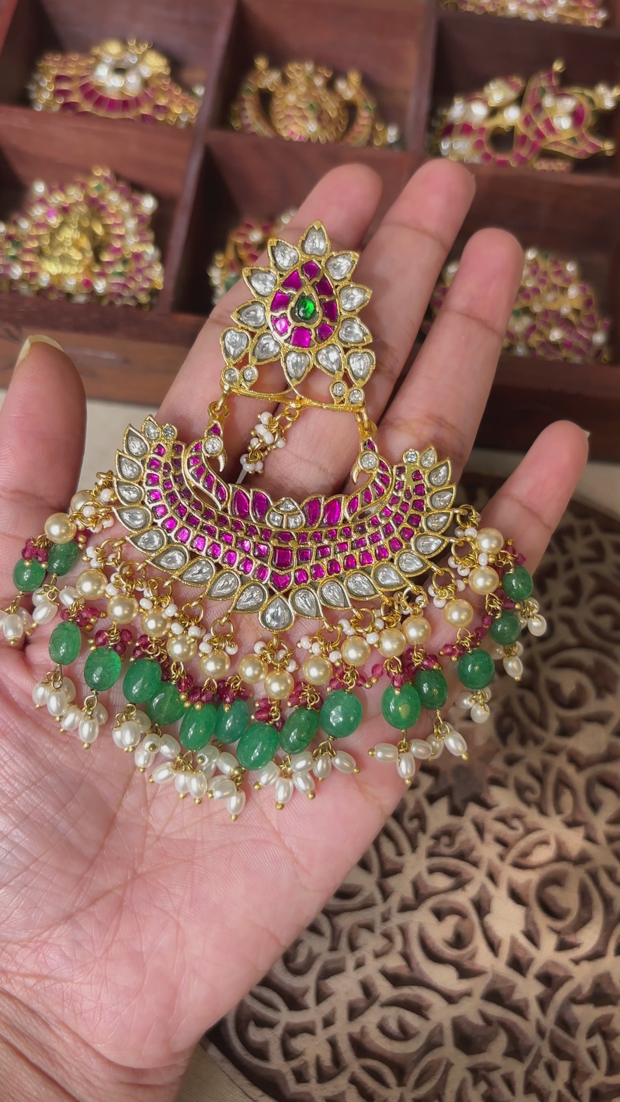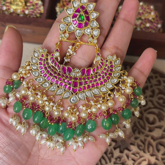 Accented with green bead hangings, this pendant adds a touch of vibrant charm and ethnic finesse. It offers versatility for various occasions — from festive events to wedding functions.