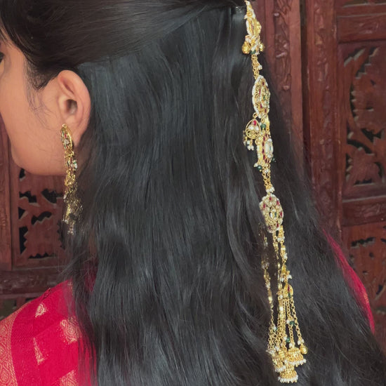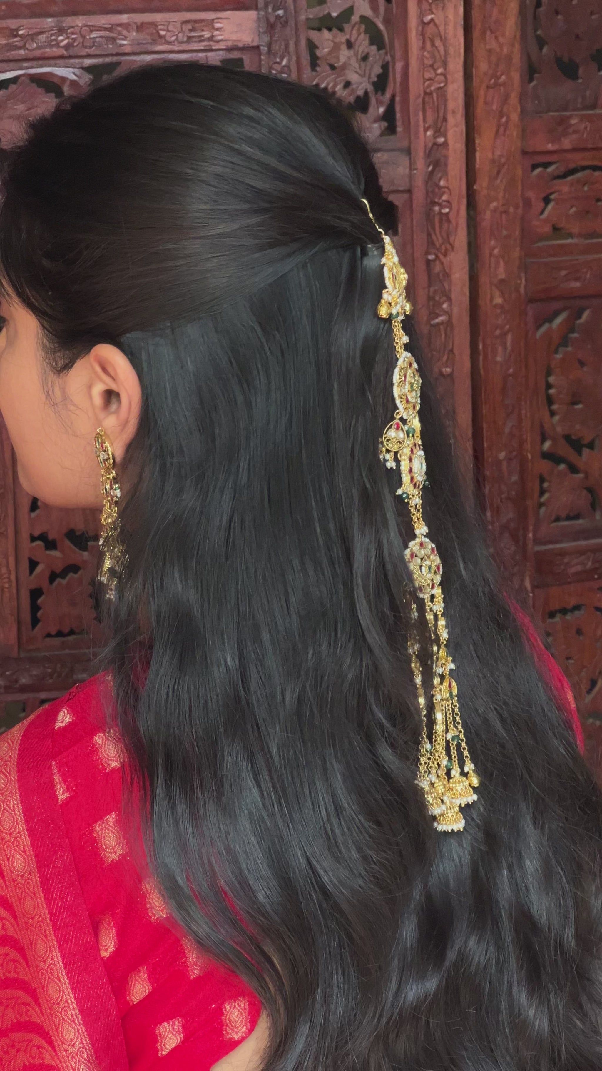 A beautifully crafted hair accessory designed to enhance your hairstyle with a graceful touch. Adorned with intricate floral elements and vibrant green stones, it flows effortlessly along your hair, finishing with an elegant jhumka detail. This versatile piece can be worn on a flowy, wavy hairstyle for a soft, romantic look or paired with a braid for a more structured and traditional charm.