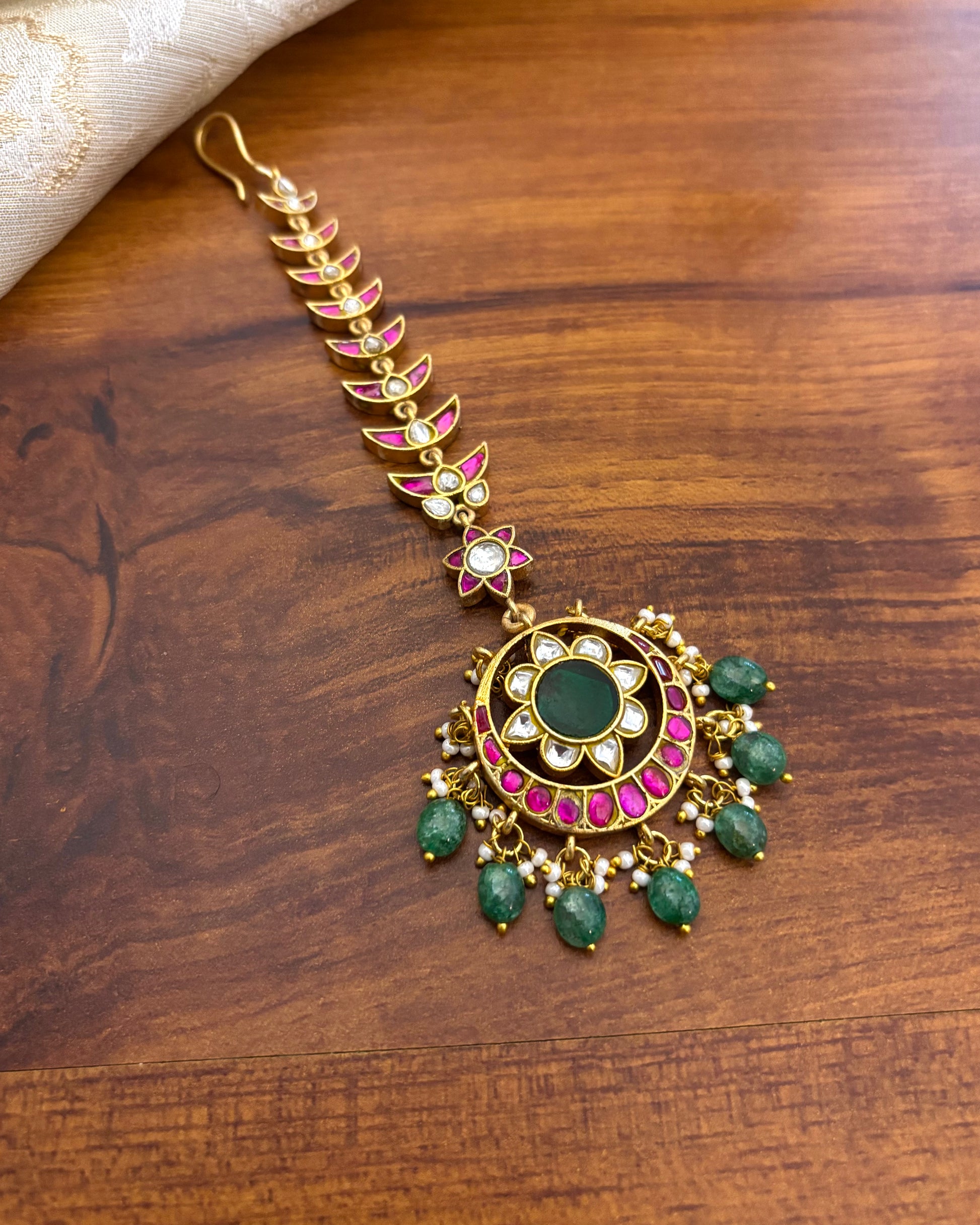 This handcrafted Jadau Kundan Maang Tikka is a beautiful celebration of heritage and craftsmanship. The design features a delicate floral-shaped pendant at the center, intricately set with white, green, and pink jadau kundan stones that add vibrant elegance. The attached chand-shaped chain gracefully extends across the forehead, embellished with fine pearl detailing that enhances its regal appeal.