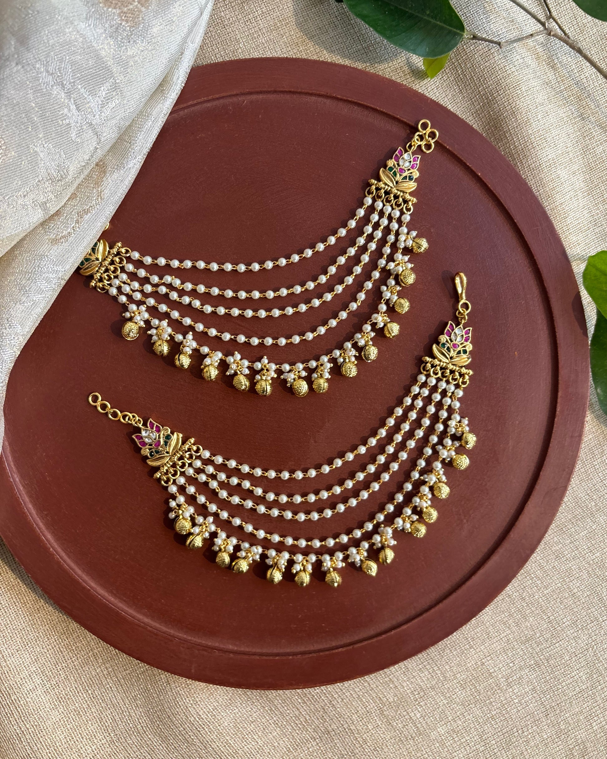 Embrace timeless elegance with this gold-plated Jadau Kundan ear chain, a perfect blend of tradition and grandeur. Intricately handcrafted with radiant Kundan stones, this piece is designed to complement your traditional jewellery collection. The delicate chain gracefully drapes along the ear, connecting to stunning motifs adorned with polished gold detailing and pearl accents.