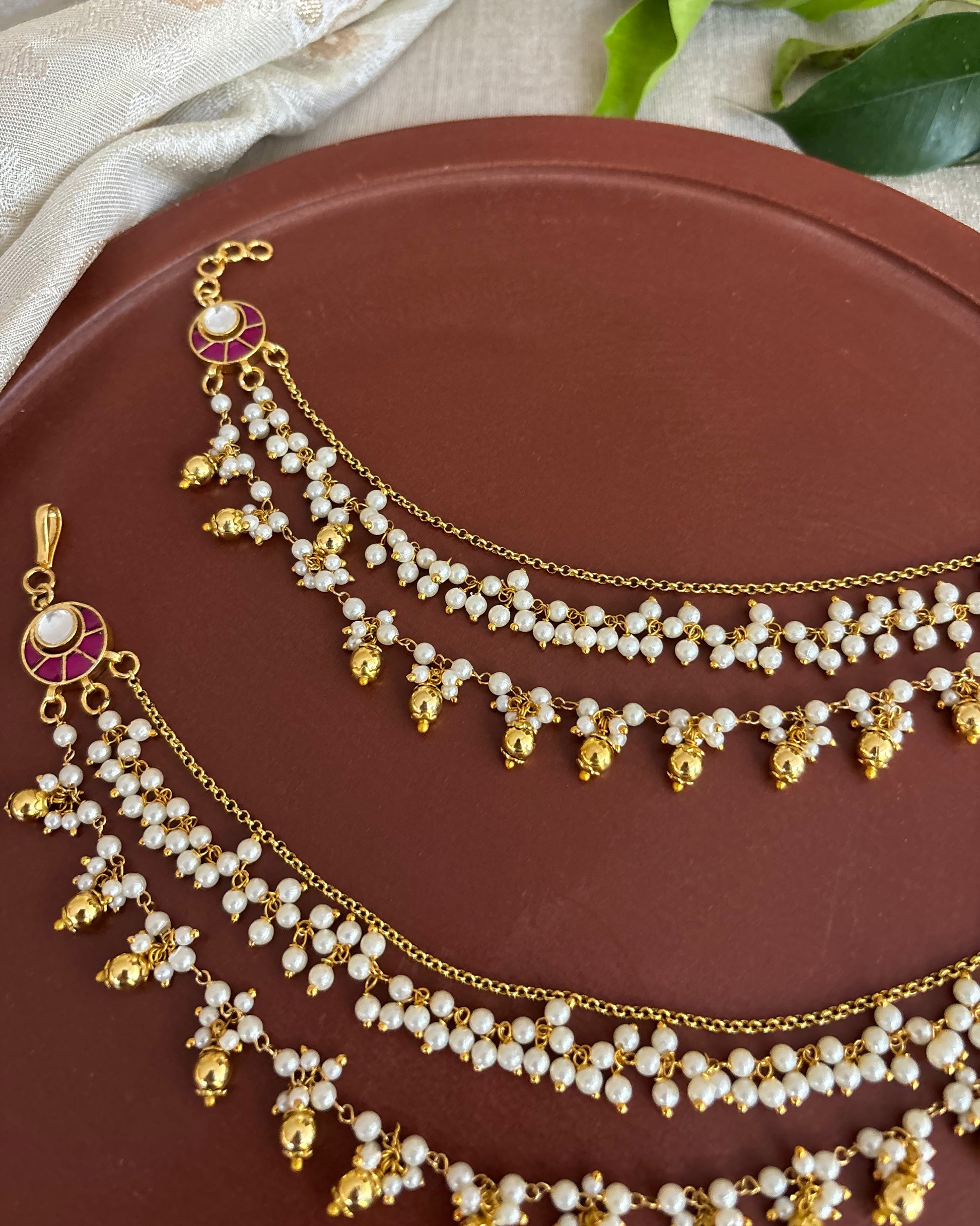 Gold Plated Triple Layered Jadau Kundan Pearl Ear Chain | EC119
