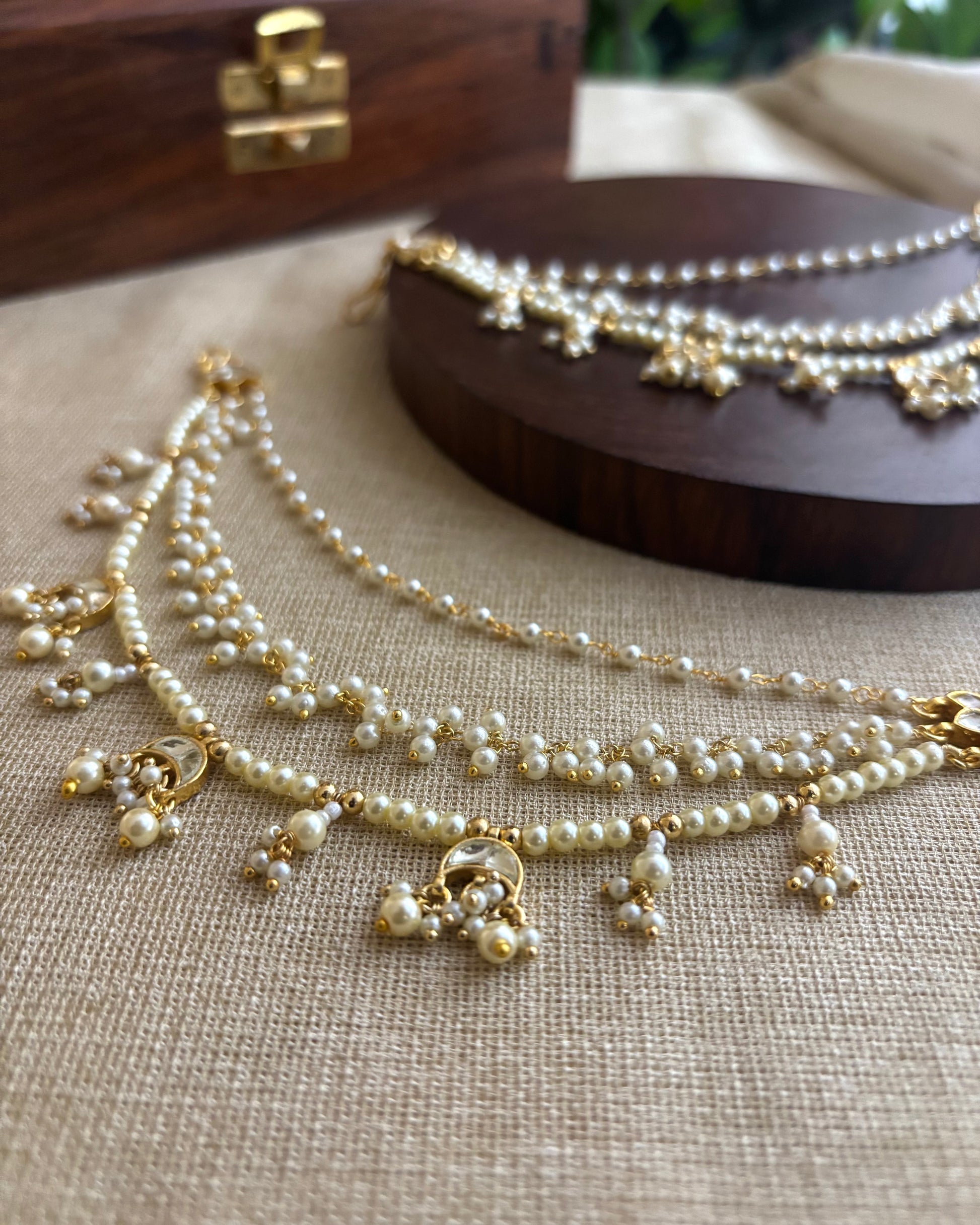 Embrace timeless elegance with this gold-plated Jadau Kundan ear chain, a perfect blend of tradition and grandeur. Intricately handcrafted with radiant Kundan stones, this piece is designed to complement your traditional jewellery collection. The delicate chain gracefully drapes along the ear, connecting to stunning floral motifs adorned with polished gold detailing and pearl accents.
