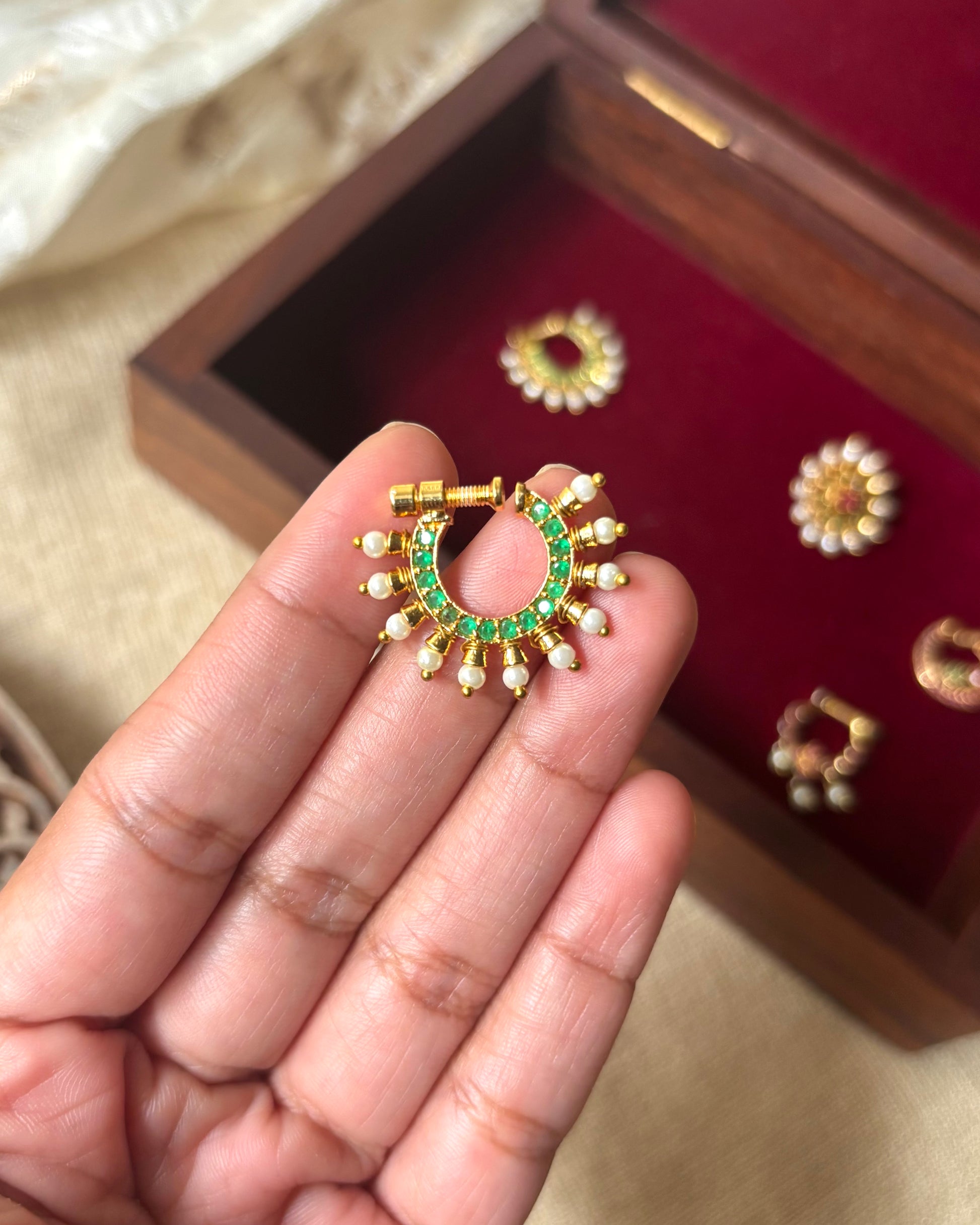 A delicate blend of tradition and charm, this nosepin is a graceful addition to your festive or bridal look. Handcrafted with precision, it features intricate work set in a subtle base that enhances its timeless appeal. Whether you're a bride looking to complete your ensemble or simply adding a touch of tradition to your style, this nosepin is the perfect understated statement. Lightweight, comfortable, and beautiful — it’s elegance in the tiniest detail.