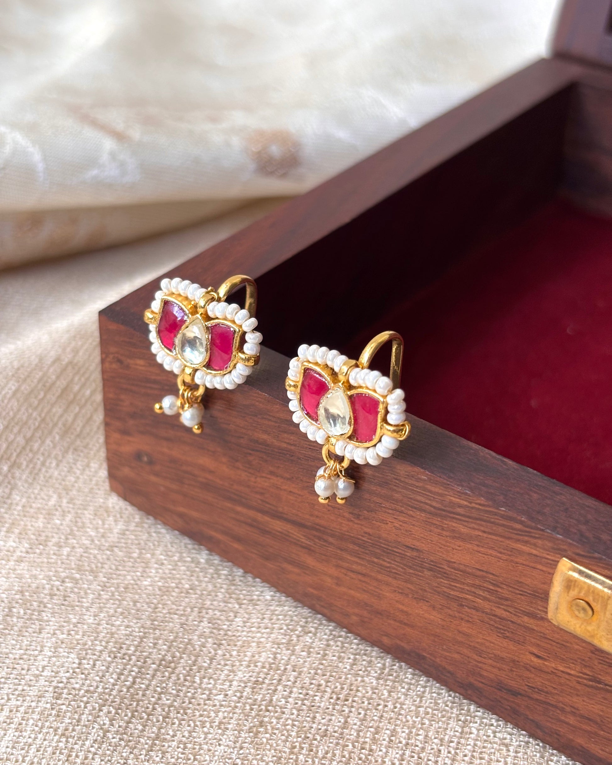 Handcrafted Pink & White Lotus Bugadi – Jadau Kundan Ear Accessory | ER076