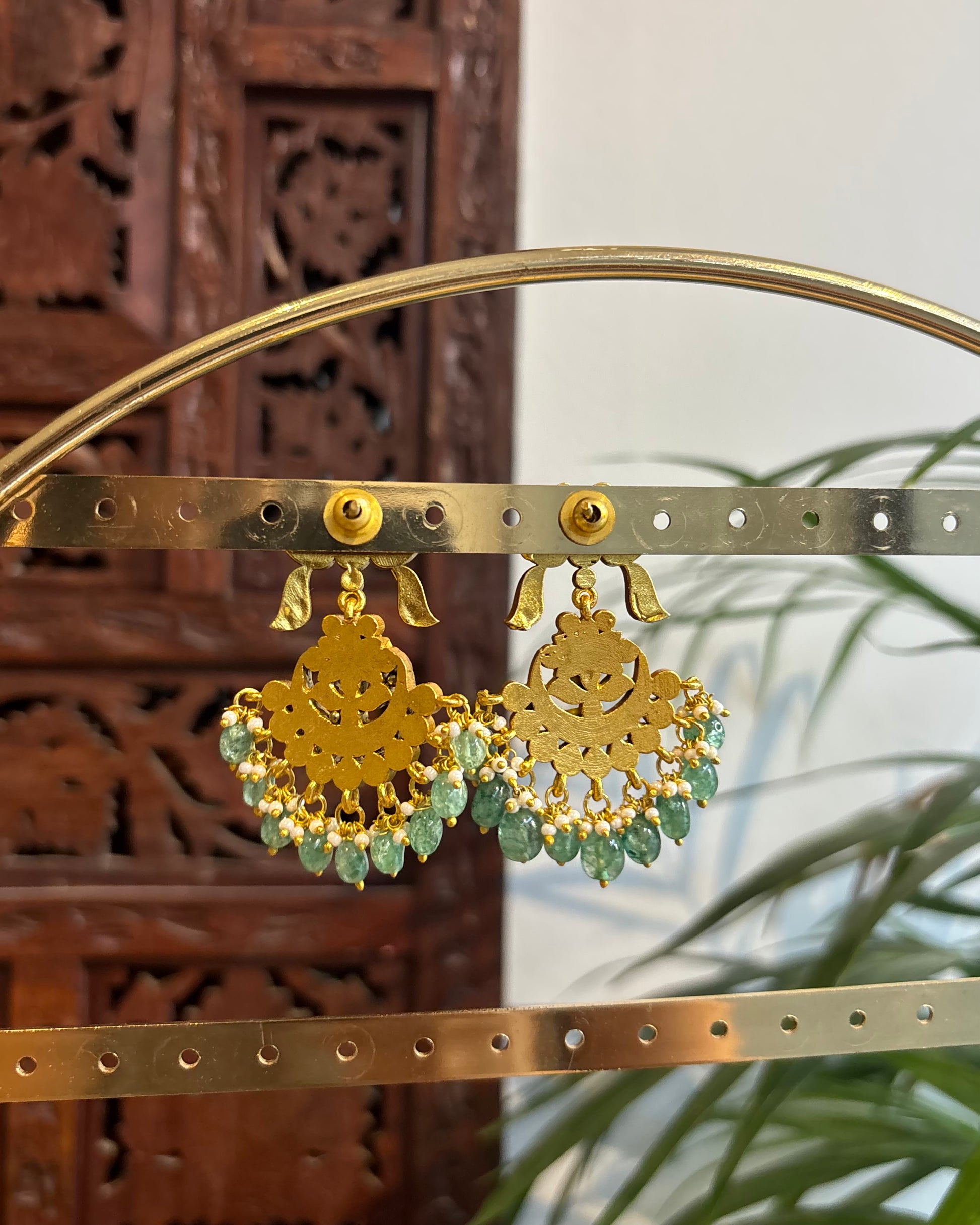 Suspended below are classic double layer earrings, beautifully detailed and finished with dainty bead hangings — creating graceful movement and a regal silhouette.